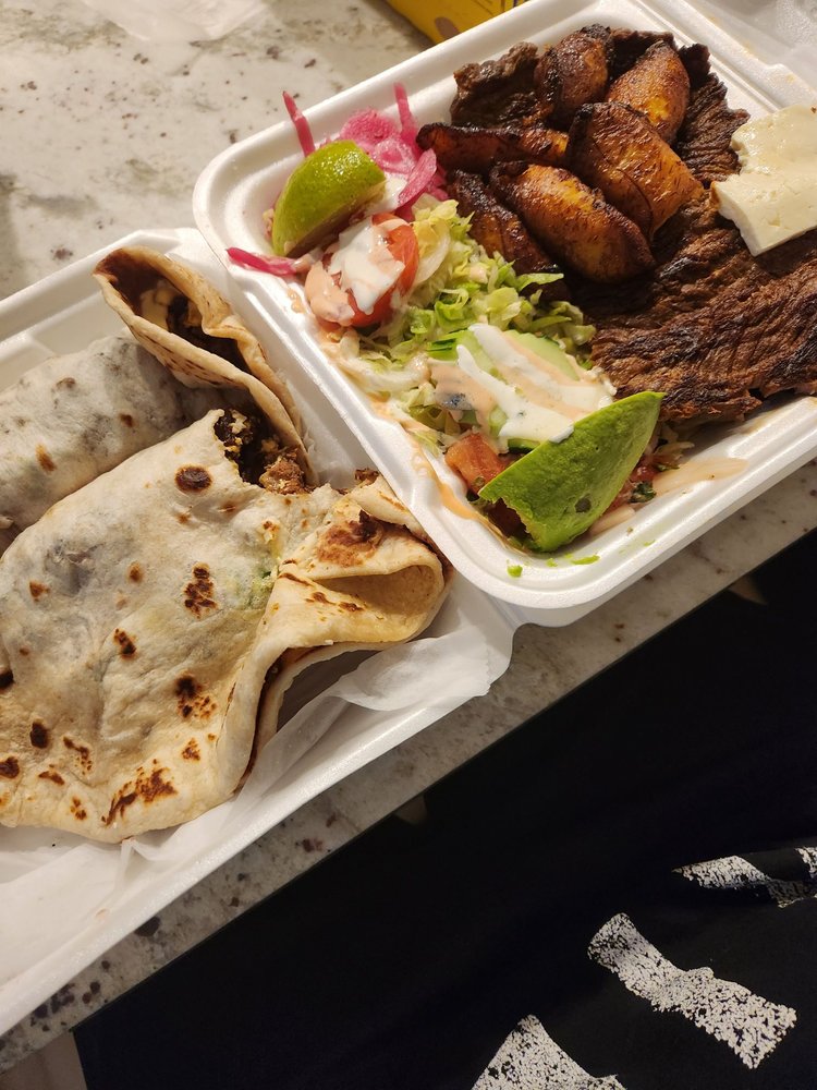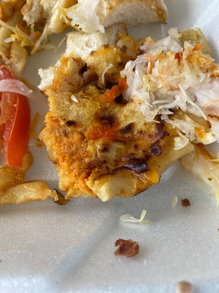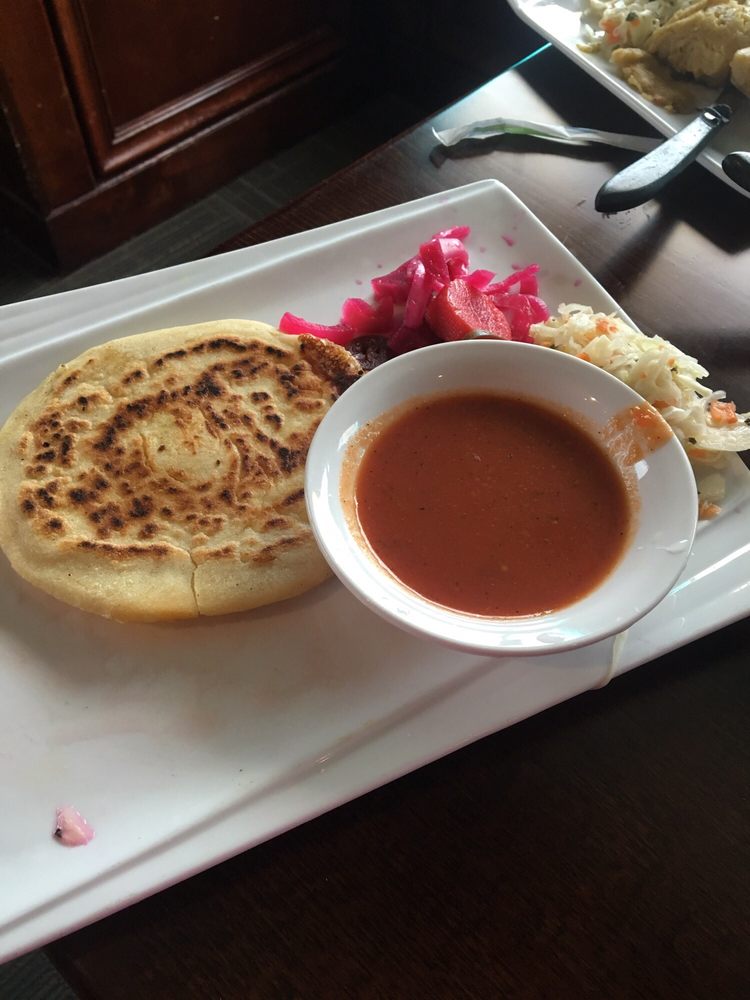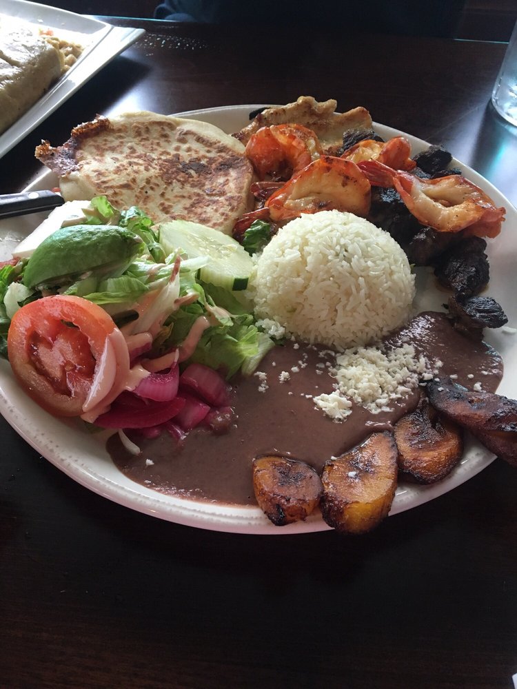 Square grilled meat, Honduran empanada, fried pork skin, cabbage salad, yucca, pico de gallo, onions and vinegar