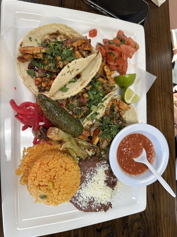 With corn tortilla, guacamole, pico de gallo, rice and beans