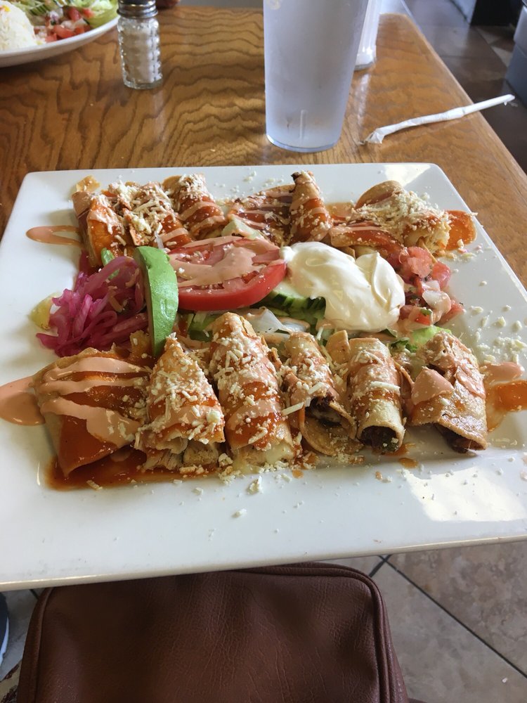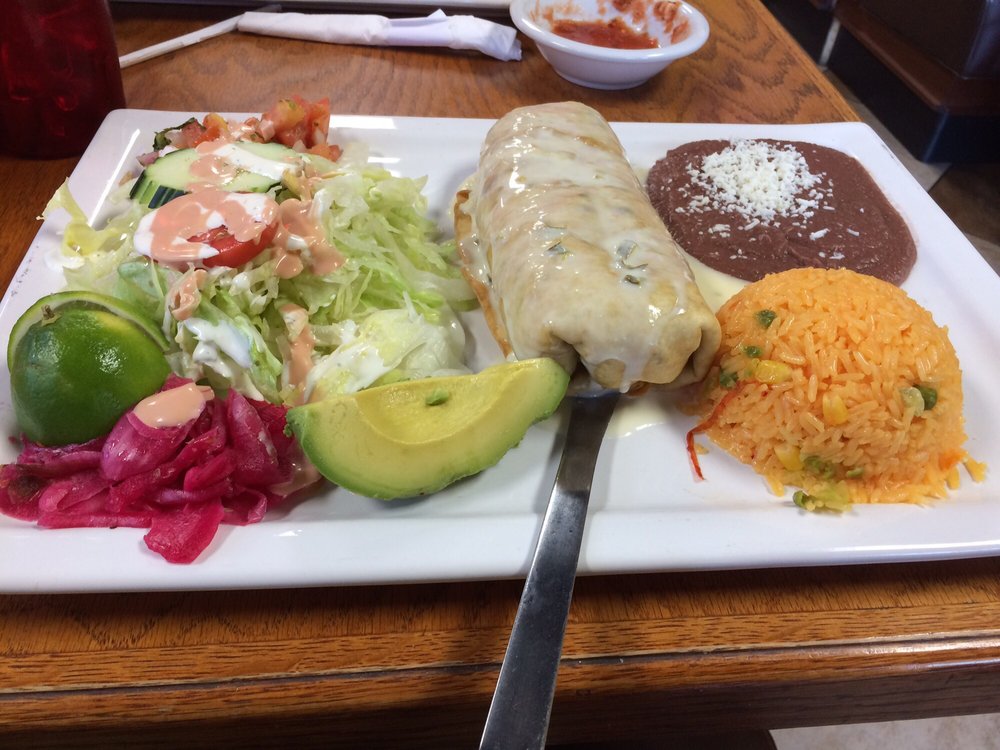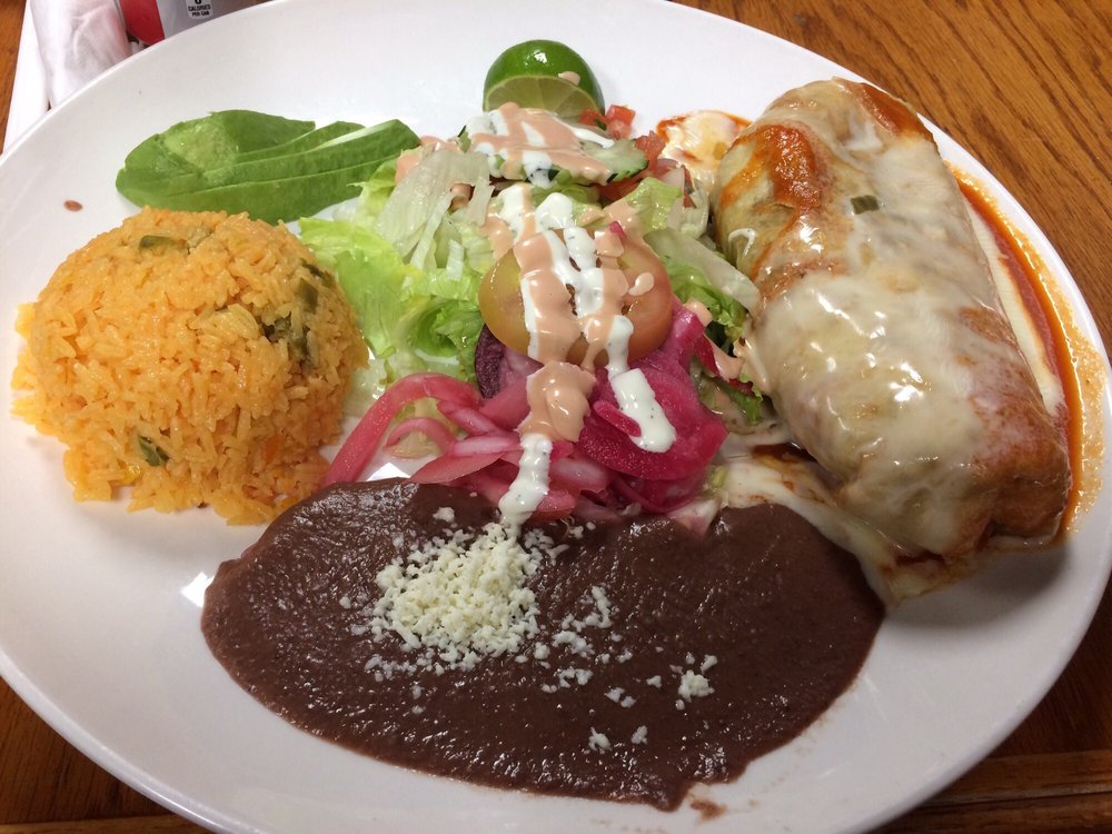 Chicken, beef and cheese served with rice, beans, pico de gallo, salad with red, white and green sauce